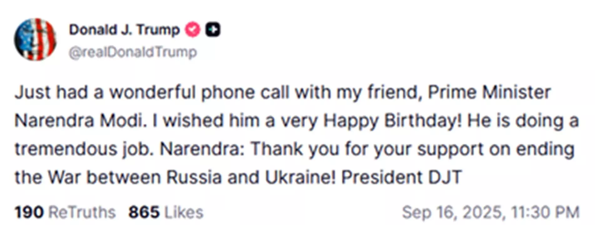 ट्रंप ने कहा, “मेरे मित्र प्रधानमंत्री नरेंद्र मोदी शानदार काम कर रहे हैं। रूस और यूक्रेन के बीच युद्ध को खत्म करने में आपके समर्थन के लिए धन्यवाद।” ट्रंप का यह संदेश 16 सितंबर की रात को पोस्ट किया गया, जिस पर बड़ी संख्या में लोगों ने प्रतिक्रिया दी। इस पोस्ट को अब तक 1.1 मिलियन व्यूज मिल चुके हैं, जबकि 4 हजार से ज्यादा बार शेयर किया गया और 43 हजार से ज्यादा लाइक्स मिले।