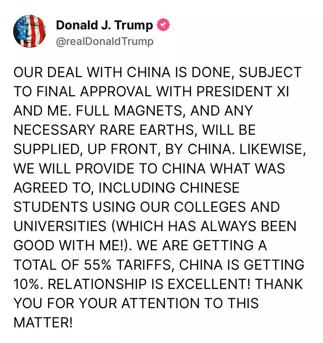 ट्रंप ने कहा कि यह डील अब चीन के राष्ट्रपति शी जिनपिंग की अंतिम स्वीकृति के बाद लागू की जाएगी। इससे पहले अमेरिकी वाणिज्य सचिव हॉवर्ड लुटनिक ने कहा था कि जिनेवा में दोनों देशों के बीच हुई पिछली बातचीत के आधार पर यह सहमति बनी है।