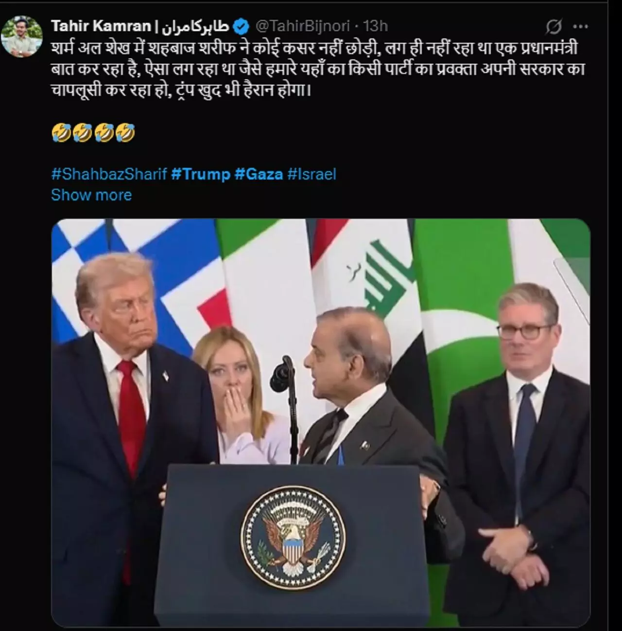 गाजा शांति सम्मेलन में सोमवार को दुनिया ने देखा कि चमचागिरी किसे कहते हैं। पाकिस्तान के प्रधानमंत्री शहबाज शरीफ ने साबित कर दिया कि उनसे बड़ा कोई "चमचा" नहीं हो सकता है। उन्होंने अमेरिकी राष्ट्रपति डोनाल्ड ट्रम्प की तारीफों के पुल बांध दिए। राजनीति में भले ही इसे कूटनीति कहा जाता है, लेकिन नेटिजंस की नजर में यह सिर्फ एक चमचागिरी है।
